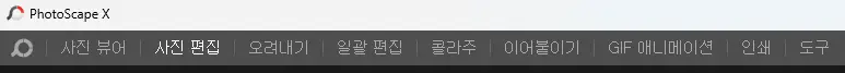 포토스케이프x의 주요 기능에 대해 알려드리겠습니다. 상단의 메뉴에는 사진뷰어, 사진편집, 오려내기, 일괄편집, 콜라주, 이어 붙이기, GIF 애니메이션, 인쇄, 도구로 되어 있습니다.